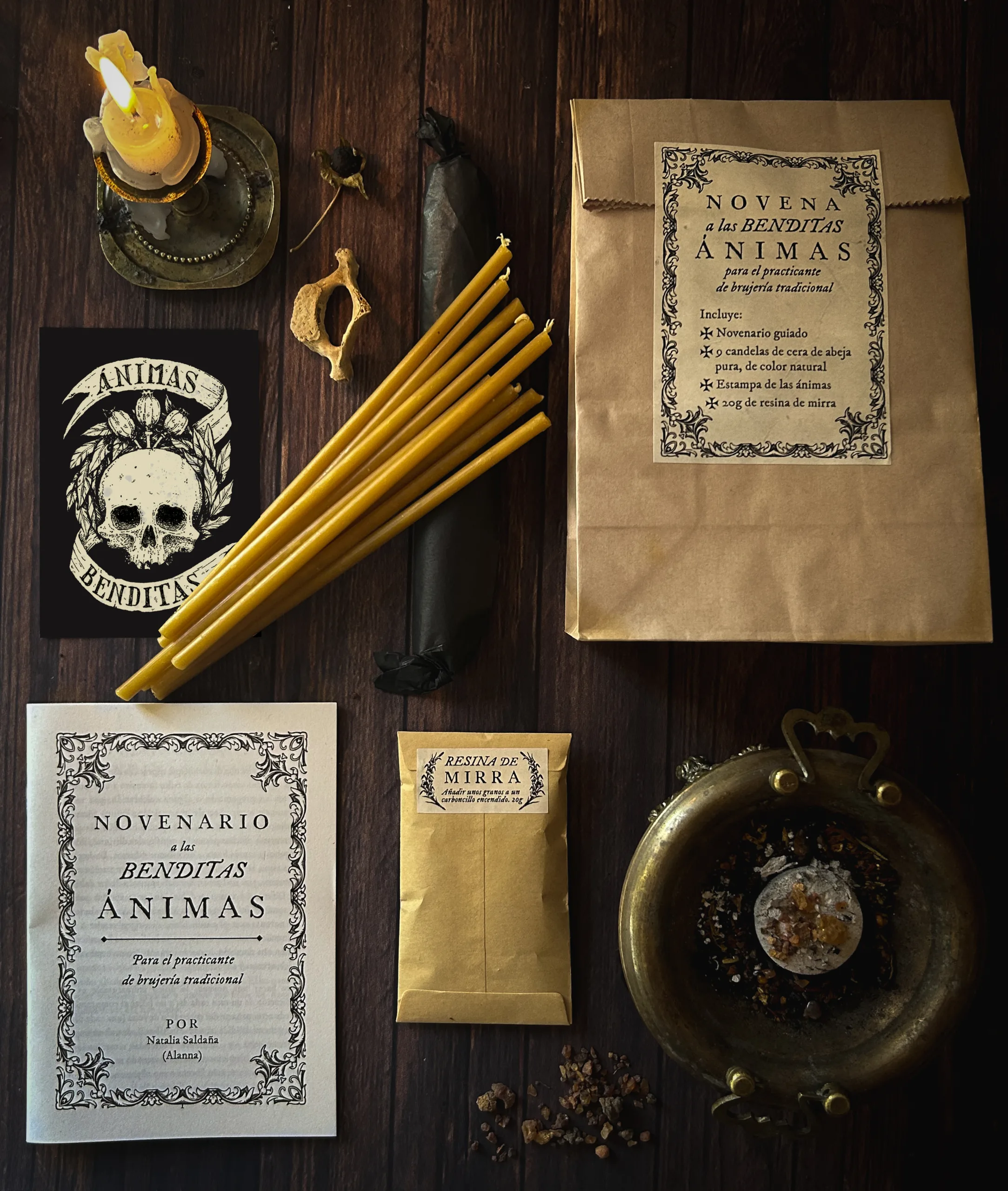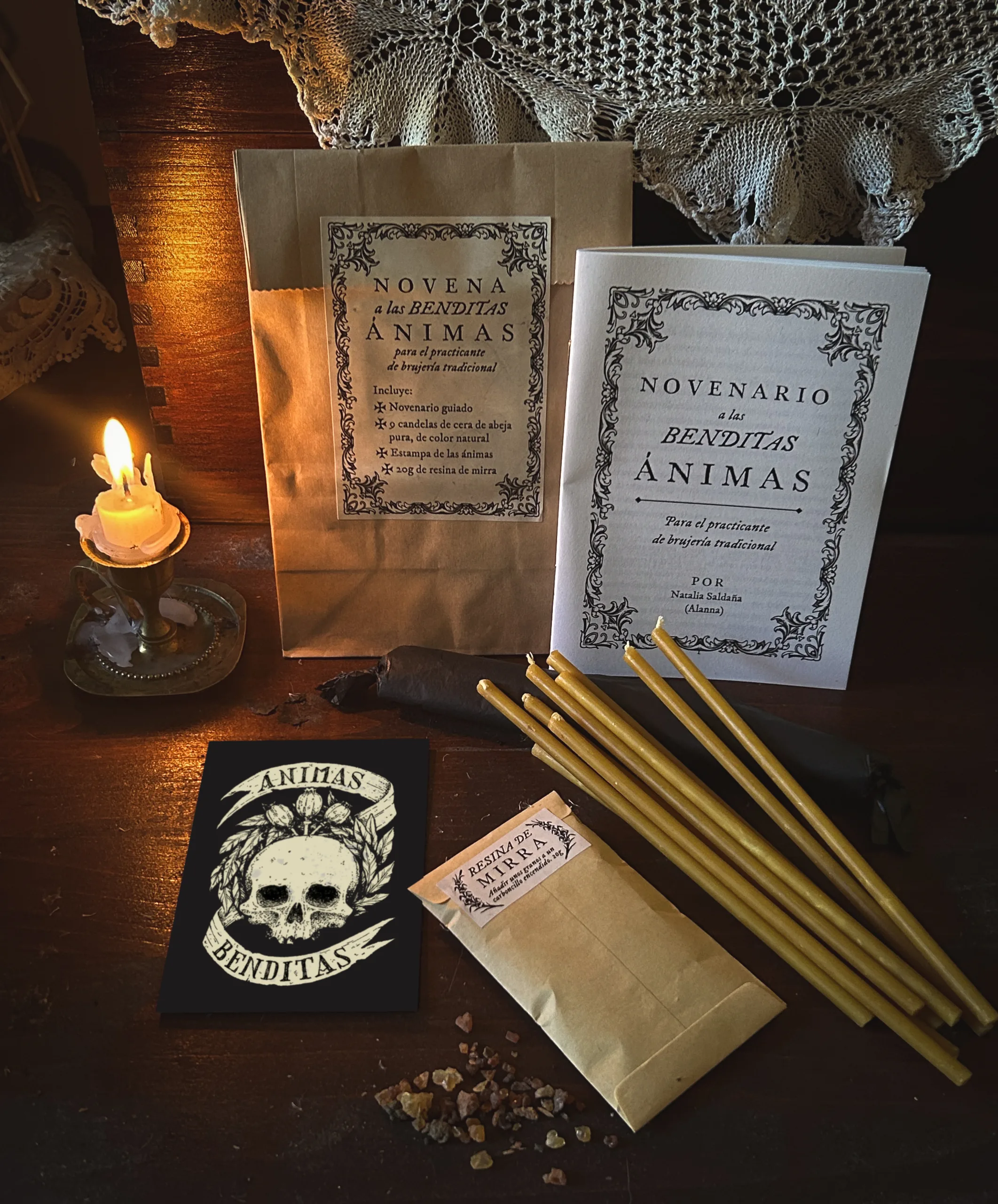 – Nueve candelas de cera de abeja de color natural, tal y como han sido las tradicionales para el culto a los muertos en nuestra cultura. Una para cada día de la novena. (Miden 17,5cm de alto por 0,5cm de grosor)