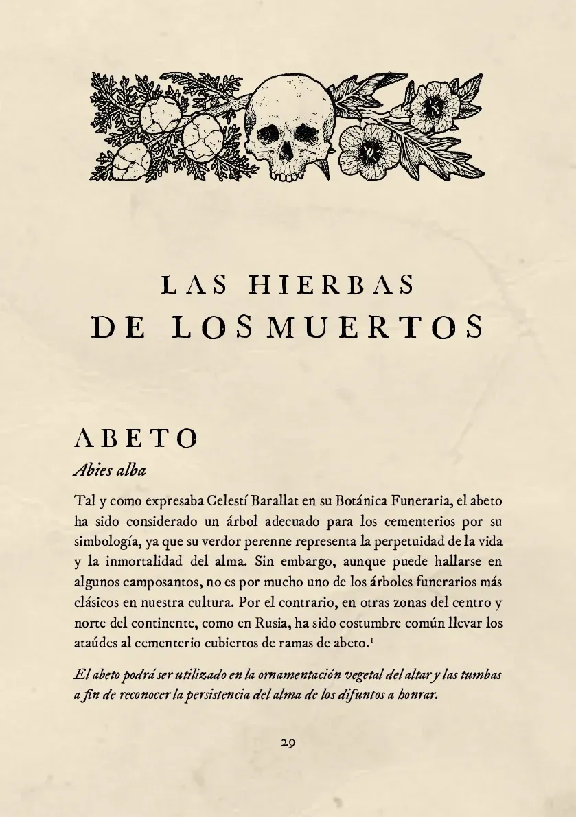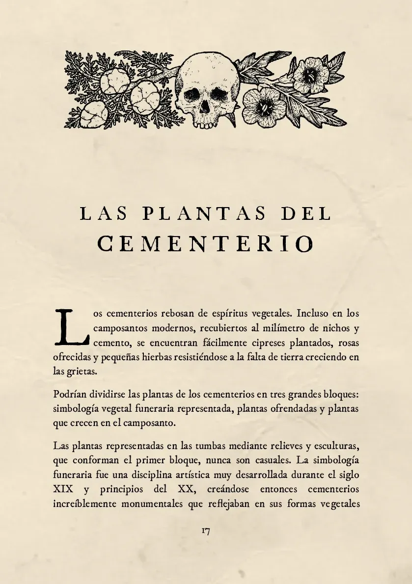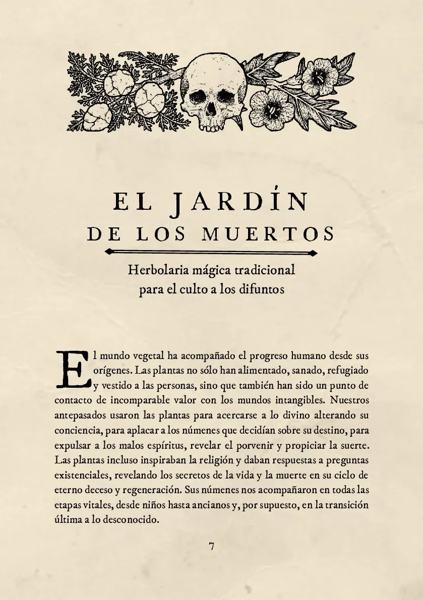 El Jardín de los Muertos: Herbolaria Mágica Tradicional para el Culto a los Difuntos invita a descubrir en 116 páginas las plantas que han acompañado al ser humano en su tránsito final desde tiempos inmemoriales. Muchas de ellas están presentes en nuestra vida cotidiana, pero sus profundos vínculos con la muerte y el mundo espiritual son a menudo ignorados. Esta obra ofrece una mirada detallada sobre 65 especies vegetales que el folklore europeo y español han vinculado con la muerte, la protección de los vivos y el acompañamiento de las ánimas, revelando leyendas y costumbres mágicas que han sido transmitidos de generación en generación. A través de un enfoque animista y un profundo respeto hacia los espíritus de las plantas, el lector aprenderá no sólo a conocer estas aliadas verdes, sino también a forjar una conexión personal con ellas en sus prácticas de necromancia y culto a los difuntos.