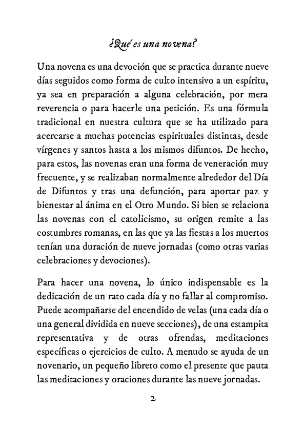 Una novena es una devoción que se practica durante nueve días seguidos como forma de culto intensivo a un espíritu, ya sea en preparación a alguna celebración, por mera reverencia o para hacerle una petición. Es una fórmula tradicional en nuestra cultura que se ha utilizado para acercarse a muchas potencias espirituales distintas, siendo muy importante en el culto a los difuntos, a los que se dedicaban normalmente alrededor del Día de Difuntos y tras una defunción. Si bien se relaciona las novenas con el catolicismo, su origen remite a las costumbres romanas, en las que ya las fiestas y ritos funerarios dedicados a los muertos tenían una duración de nueve jornadas.