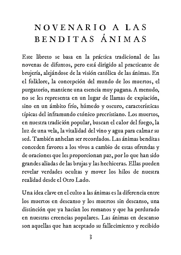 Este libreto novenario está ideado para guiar una novena a las ánimas dirigida al practicante de brujería. Se enfoca en las ánimas en descanso, entre las cuales se incluyen la mayoría de los ancestros, y busca trabajar con ellas desde el respeto y la reciprocidad. Además, se basa en otras nociones paganas presentes en nuestro sustrato indoeuropeo, como el mito de la Cabalgata Nocturna (o caza salvaje) o la figura de la Dama Negra, la diosa o señora del inframundo, que encarna el poder generativo de la muerte y guarda a los difuntos.
